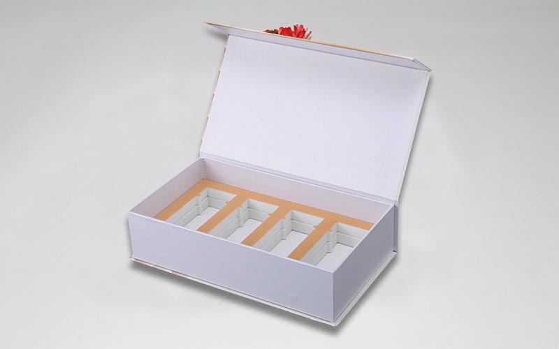 1.材質:盒子面紙用白色珠光紙,彩色印刷,裱1500G雙灰闆,盒子内托用白色EVA植絨橘色。盒子制作比較簡單,翻蓋盒,機器自動話制作。
