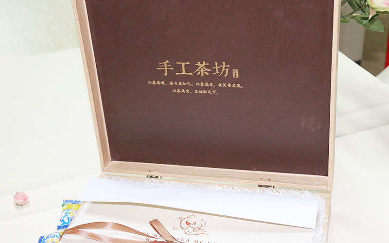 1.材質:茶葉包裝盒定制盒子中心用特種紙熱壓紋路,無印刷,直接燙金産品名字激凸,标志燙紅金,地址信息燙黃金,盒子正中心貼一個産品代表圖案,盒子外框制作5MM厚度的木質材料.盒子内部結構上盒貼特種紙燙金文字,下盒内托0.5MM厚度上面鋪上進口高檔寶白色絨布,絨布上面放一張白色特種紙文字燙金,蓋一層紙能讓産品更有一種神秘感 。盒型爲翻蓋盒,盒子的翻蓋地方上一個自動的小鎖扣,顯得更加漂亮精緻整款盒子手工制作精細,紙張和木質結合更加環保 。