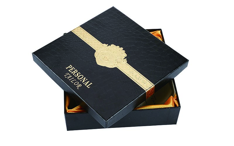 1.皮帶包裝盒定制-材質:盒子面紙採用180G紋路特種紙,裱1800G雙灰闆,表面文字燙金LOGO,盒型爲上下天地盒,整款盒子都採用特種紙制作,盒内採用泡沫裱一層黃色綢緞布,整款盒子都採用手工精細制作