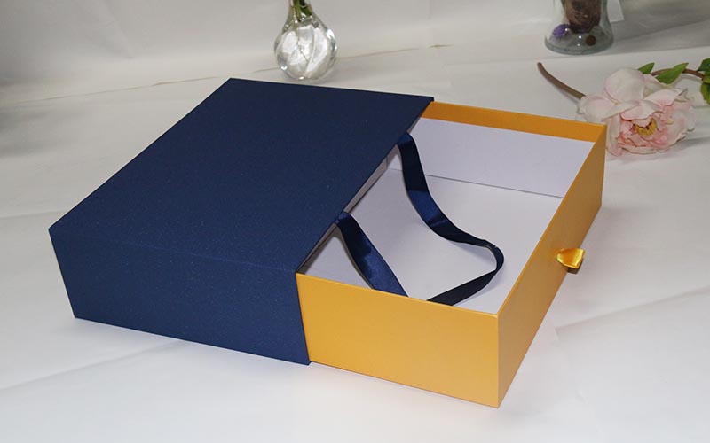 1.材質:盒子面紙用藍色磨砂特種紙,内盒也在用金黃色特種紙,裱1500G雙灰闆成品粘兩條絲帶方便客戶攜帶貨物,切記貨物太重的不能這樣。不然到時候繩子斷開産品就會受損,盒子比較大整款盒子都是手工制作。