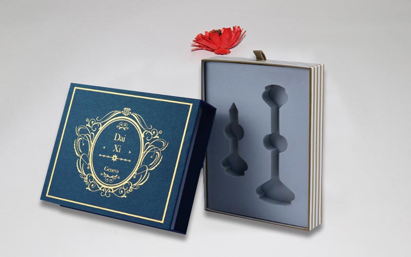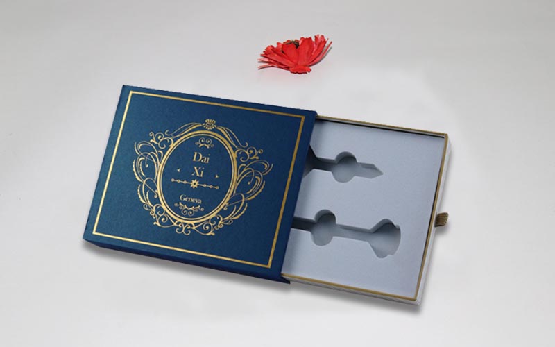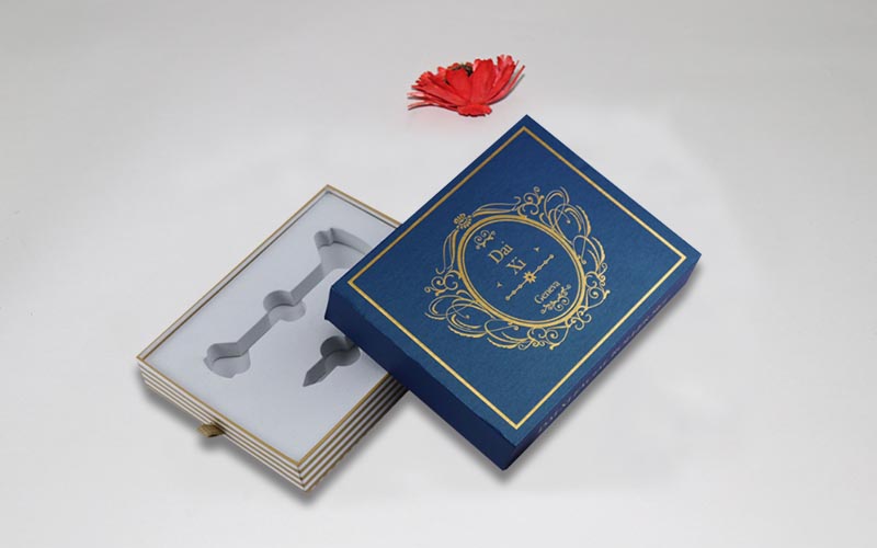 1.材質:外盒子用藍色珠光紋路的特種紙,盒子面紙文案燙黃金,裱1200G雙灰闆,抽盒157G銅版紙彩色印刷啞膜,裱1200G雙灰闆,内托用白色EVA開V槽固定産品。整款盒子機械化制作 。