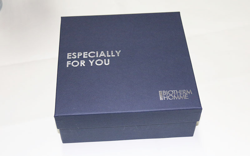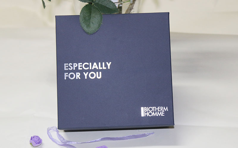 1.材質-面紙選用歐洲進口的磚石藍觸感特種紙,表面文字燙銀LOGO,下盒上盒一樣材質手工制作,裱1800G雙面白灰闆,盒型爲上下天地盒,盒内放拉斯草.整套化妝品包裝盒定制都是手工制作