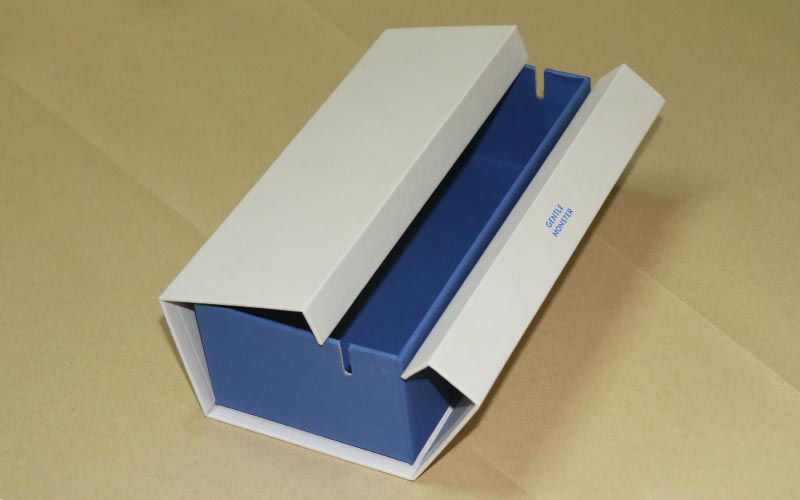 1.材質:外皮殼用米白色觸感特種紙,(特别有手感的一款紙)燙藍金LOGO,裱1500G立格灰闆,内盒同樣用藍色特種紙裱1500G雙灰闆,内盒左右兩邊開兩個槽位,盒子翻開的地方更好的卡進去,不留縫隙,手工制作。